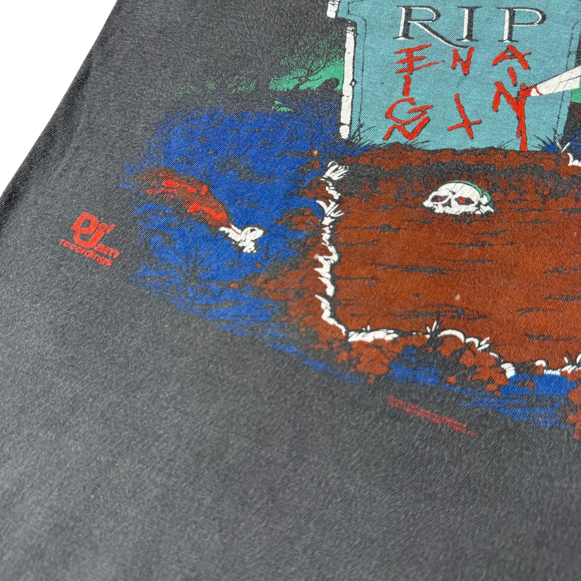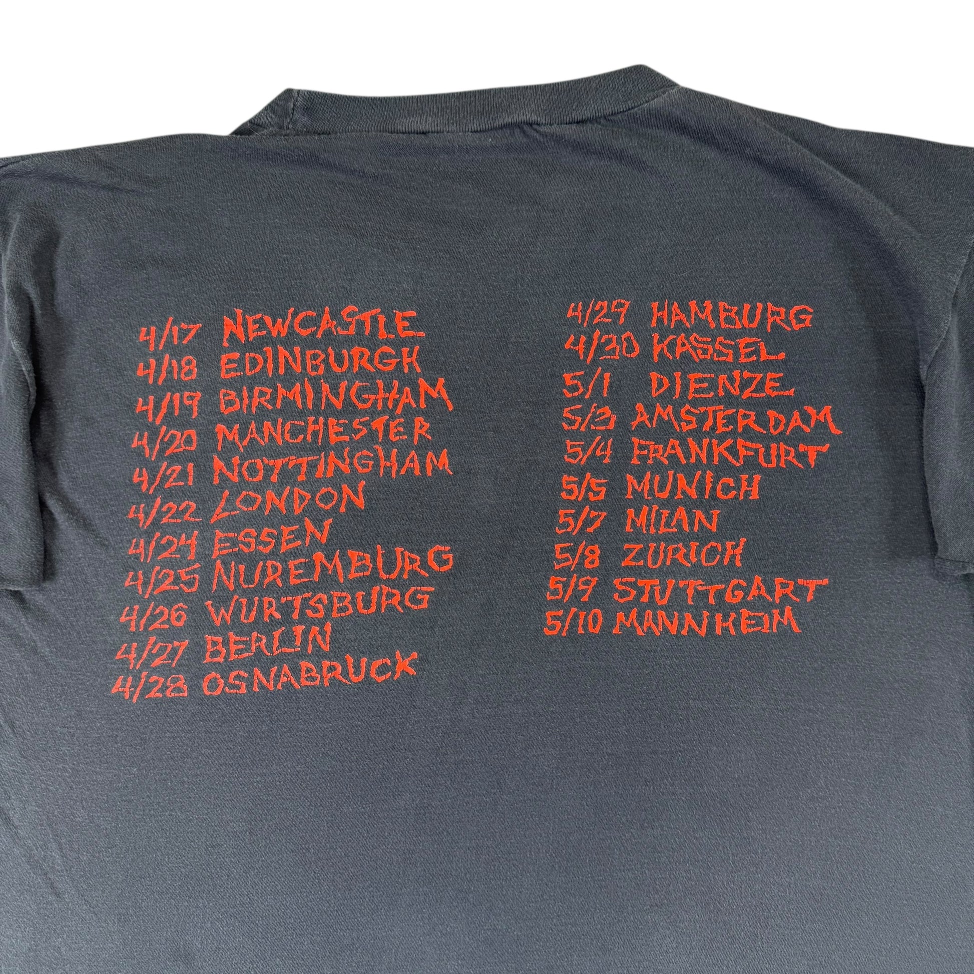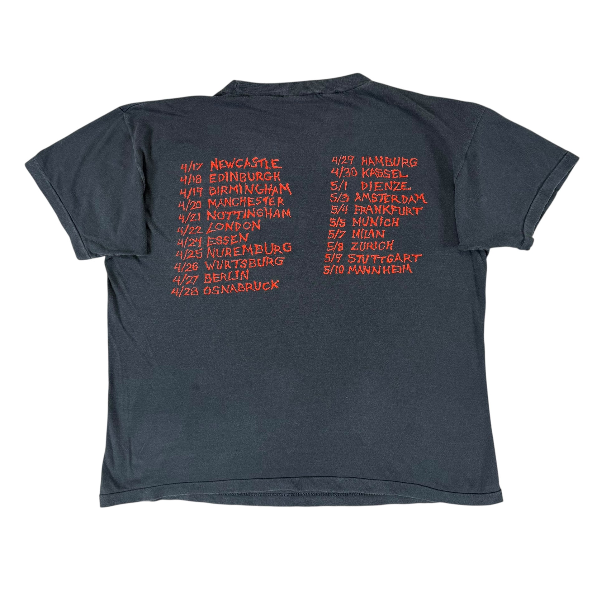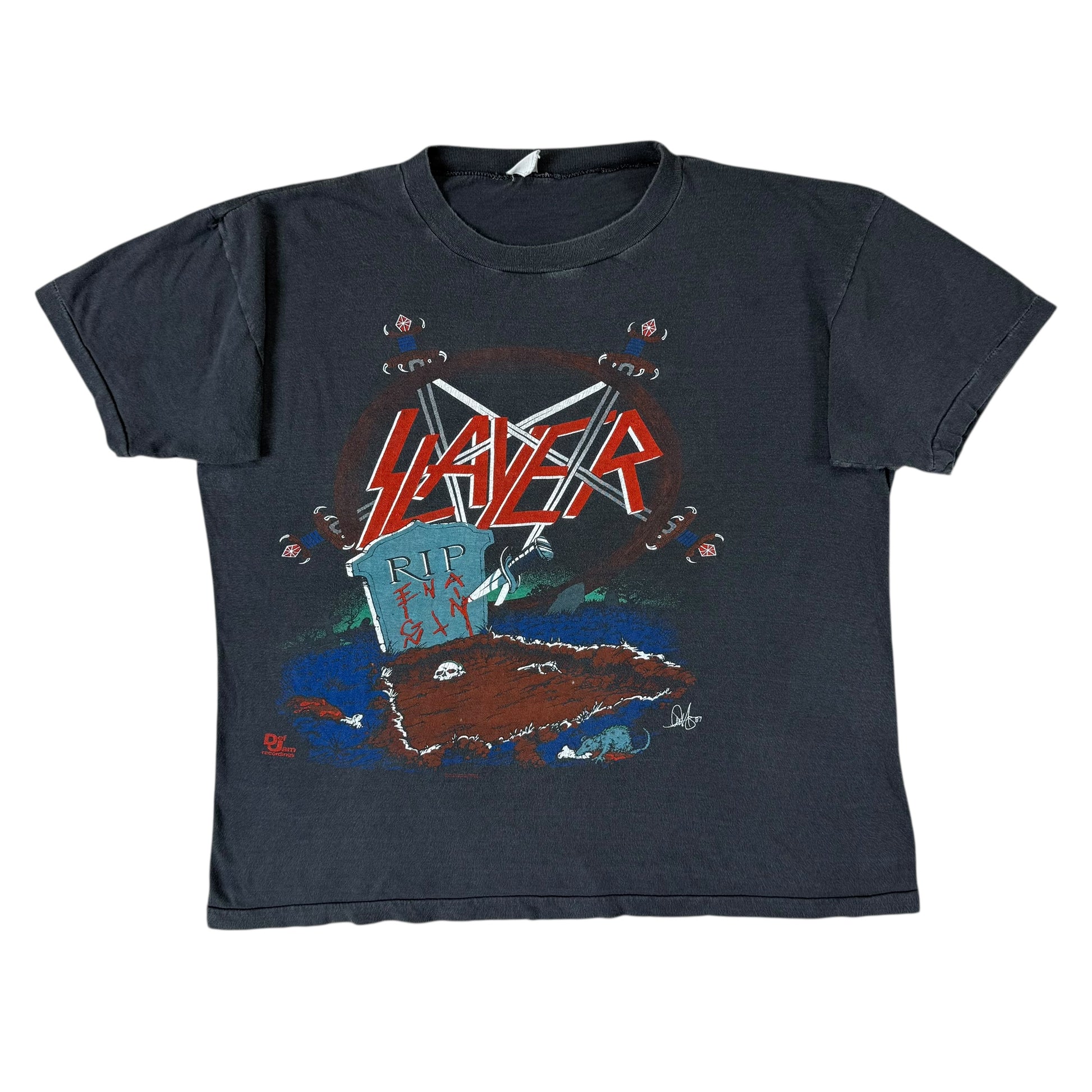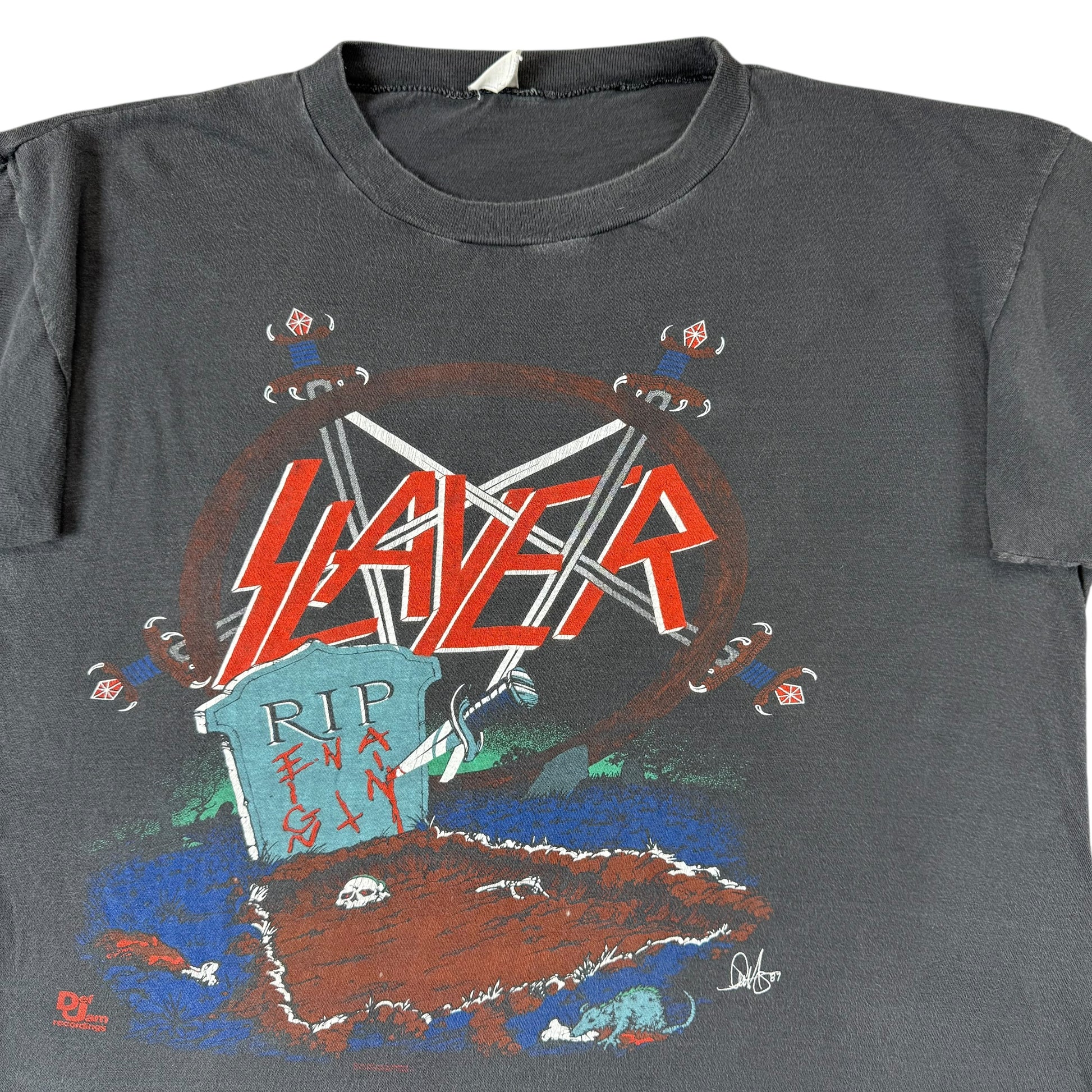 Insanely good Slayer shirt from the band’s European tour in 1987 after releasing their ‘Reign in Blood’ album the previous year. Amazing front graphics with Def Jam licensing and tour date on the reverse. Faded and softened, no holes/flaws.