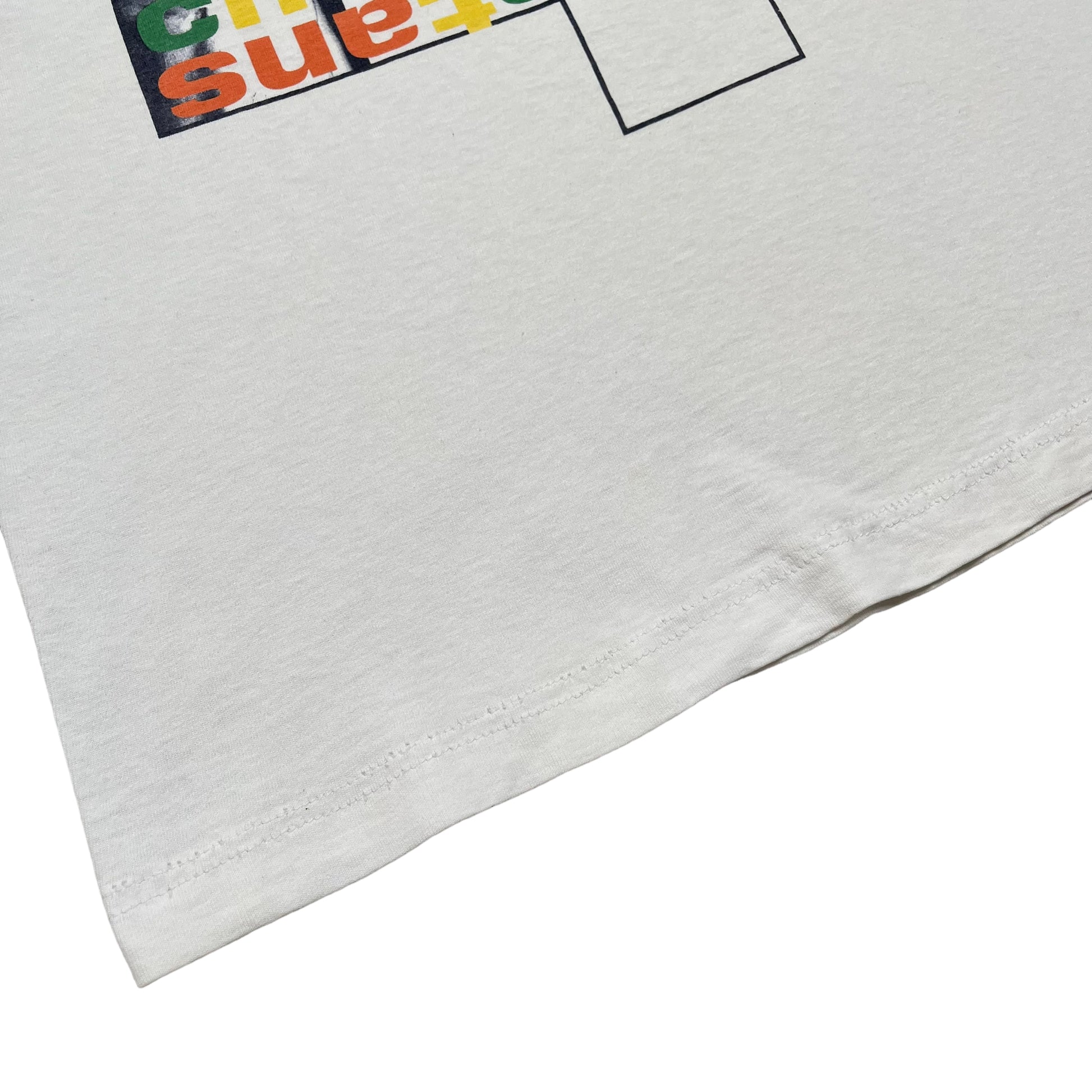 Killer Charlatans shirt purchased around the time of the release of the band’s debut album ‘Some Friendly’ in 1990. The shirt features a brilliant multicoloured spellout across the chest with an inverted image of the band beside it. The shirt has been shortened to fit very cropped and rehemmed in a fairly rudimentary fashion and has some yellowing to the collar.