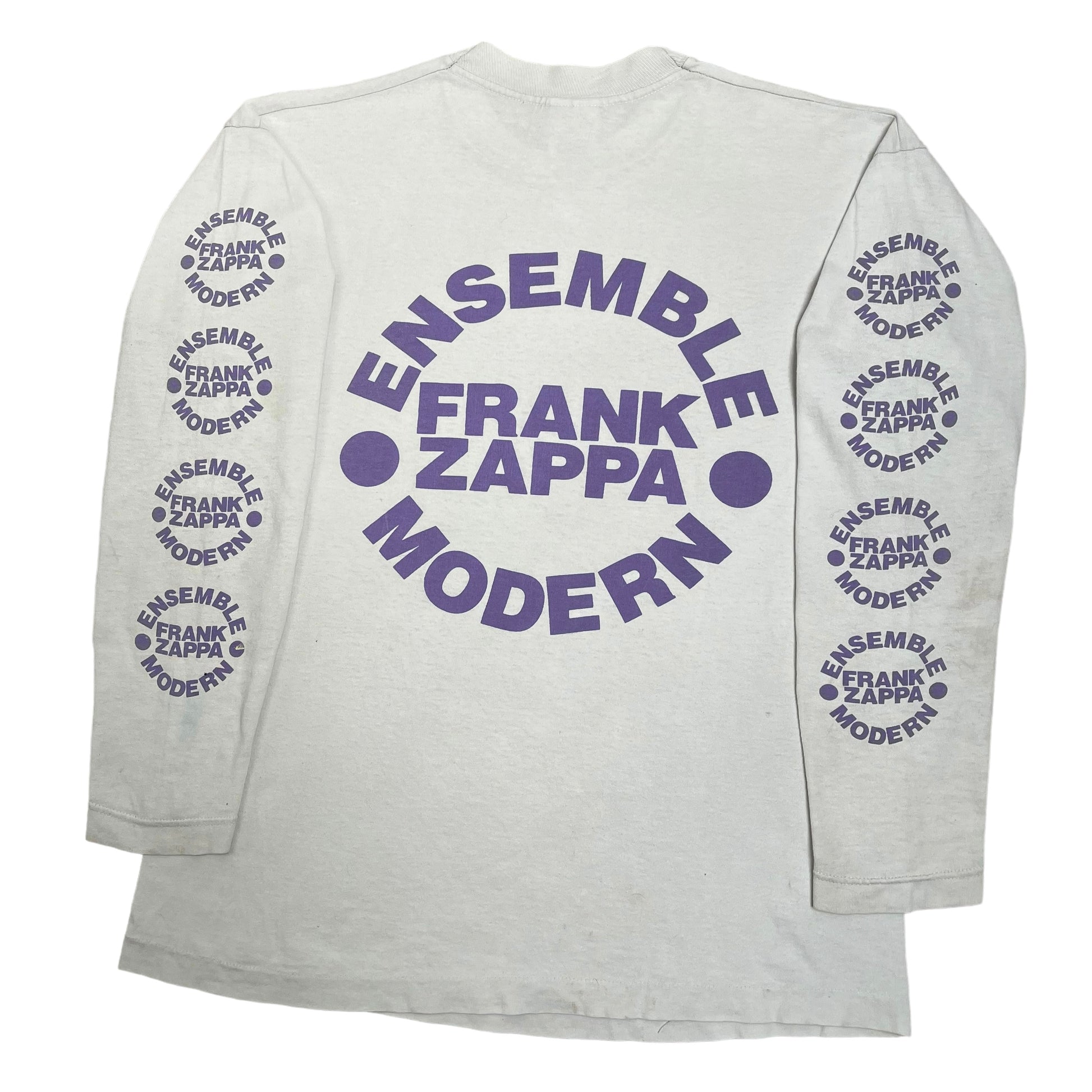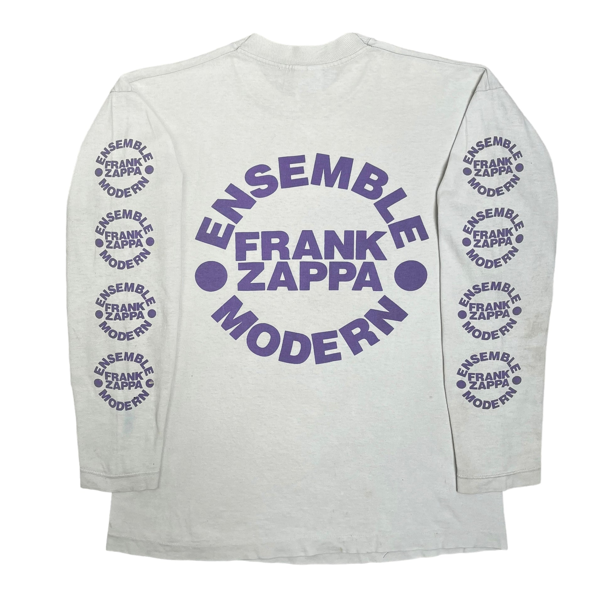 Incredibly striking long sleeve tour shirt from Frank Zappa's 1992 collaborative project with Ensemble modern entitled 'The Yellow Shark' - the shirt features an awesome image of Zappa on the chest with purple spellout and repeated purple graphics down each sleeve and on the reverse. Worn in nicely with a couple of marks and minor holes dotted around.