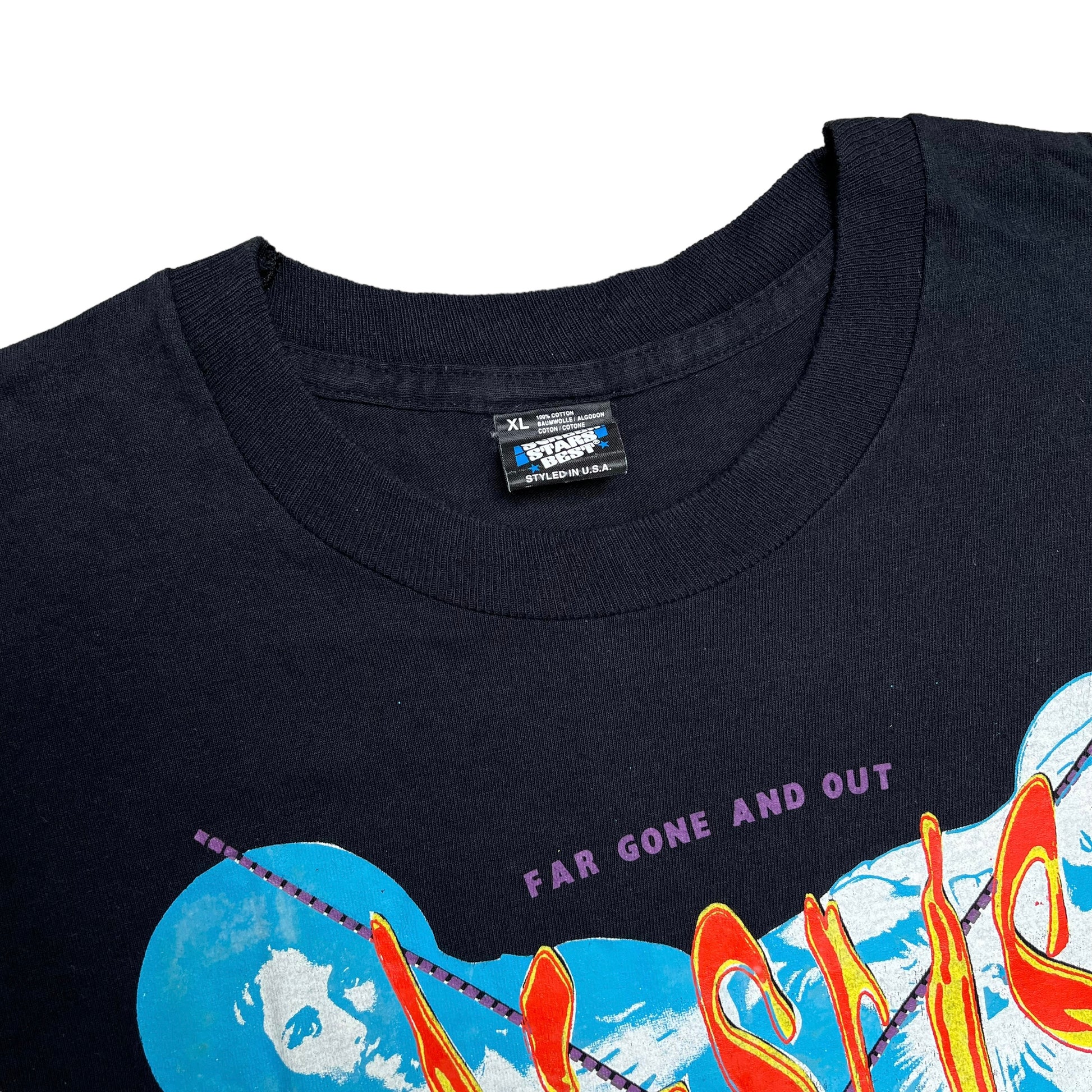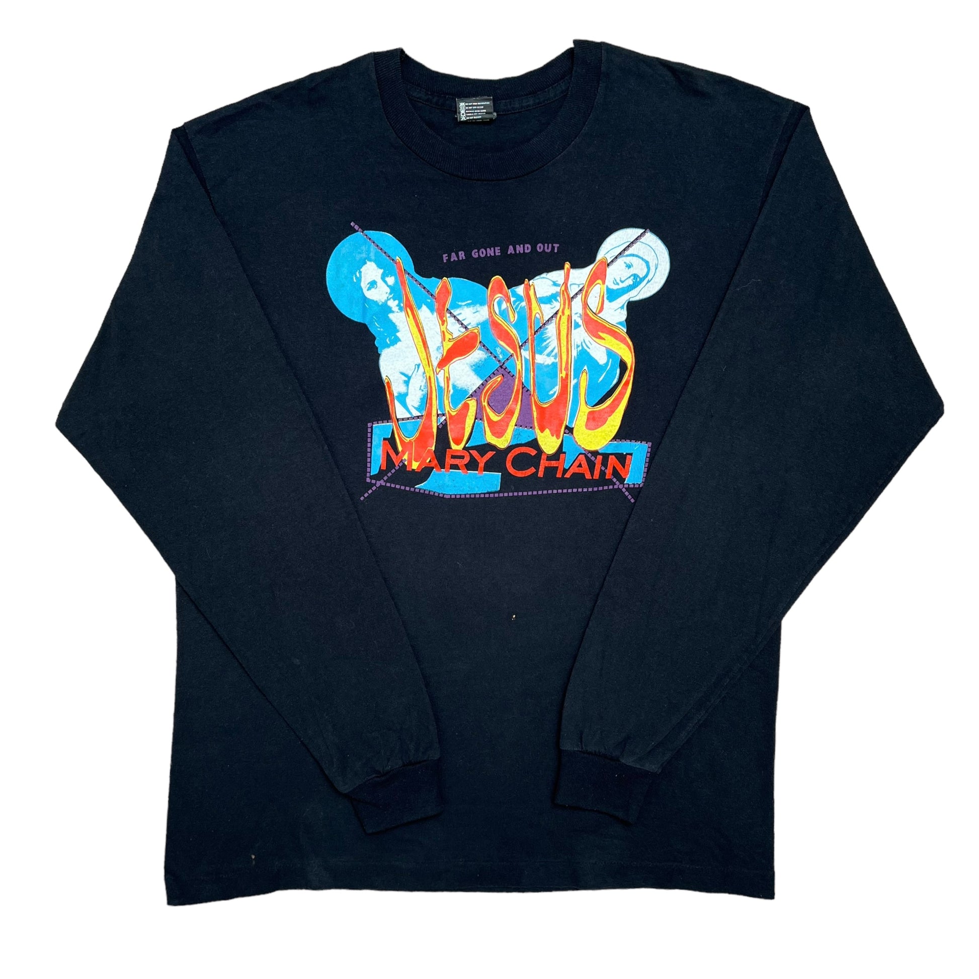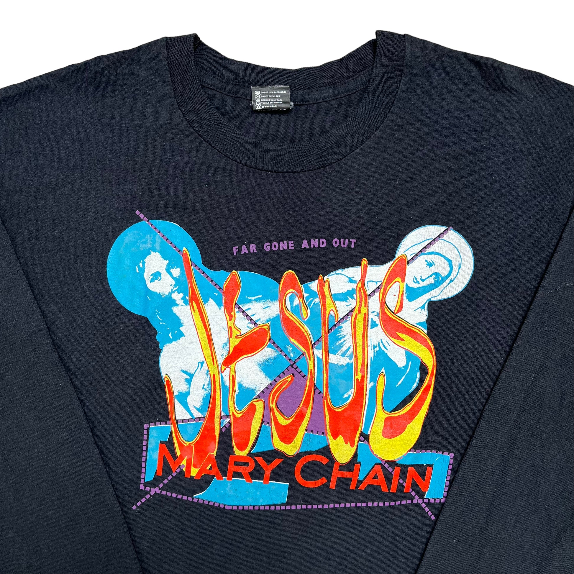 Amazing long sleeve The Jesus and Mary Chain shirt produced around the time of the bands incredible 1992 album ‘Far Gone and Out’ - it features an awesome collaged graphic of images of Jesus and Mary and typography taken from the album’s cover with similar spellout graphic on the reverse. Printed on a super heavyweight Screen Stars Premium tee in deadstock condition.