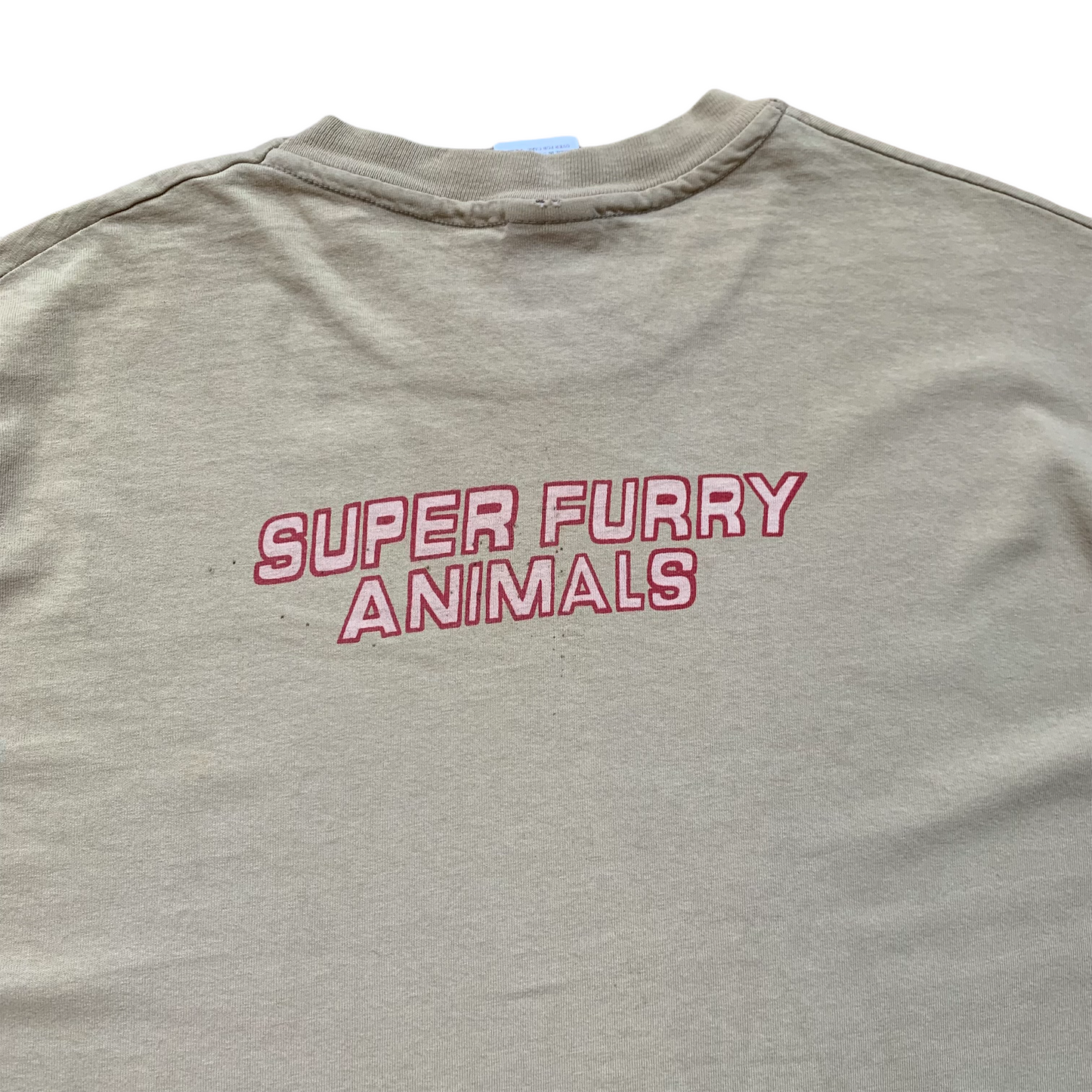 Dead nice promo shirt for Super Furry Animals second album release on Creation Records; ‘Radiator’. Lovely sand coloured shirt featuring artwork in their classic cartoon style with a great spellout on the reverse. Minor wear to hem.
