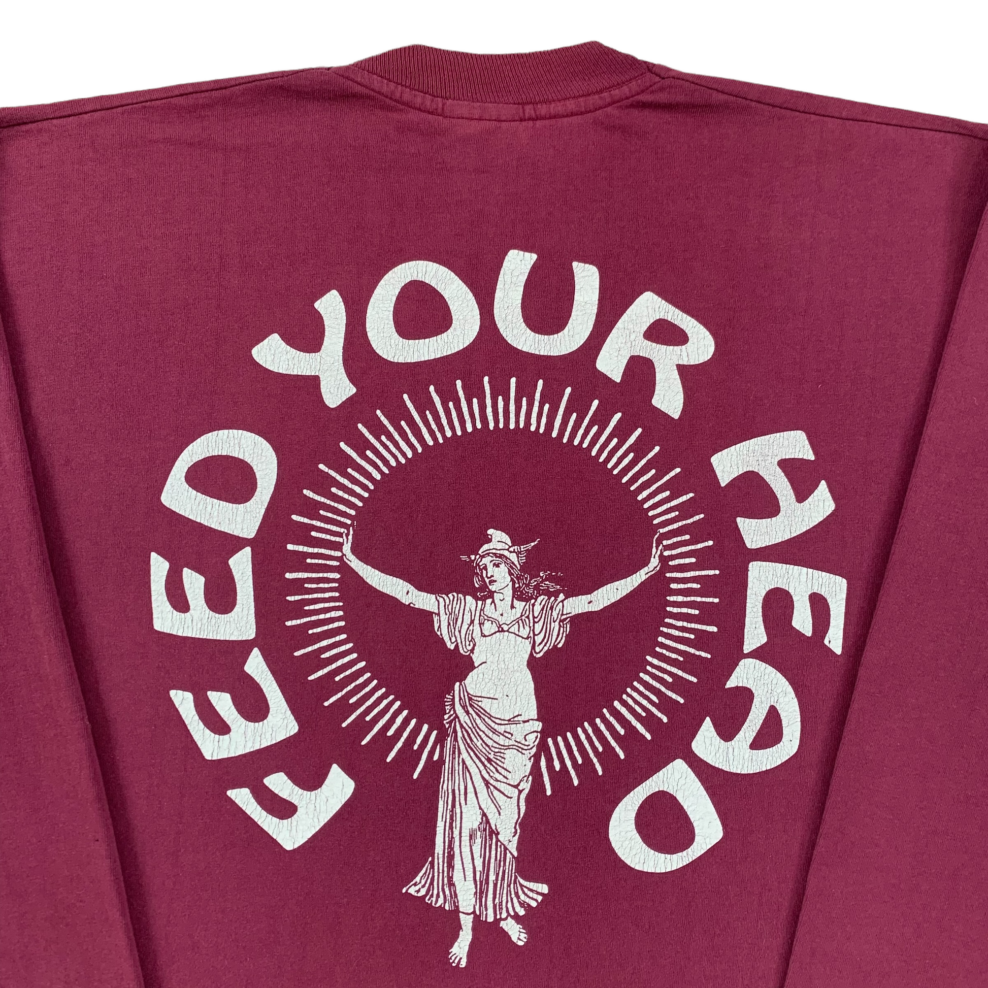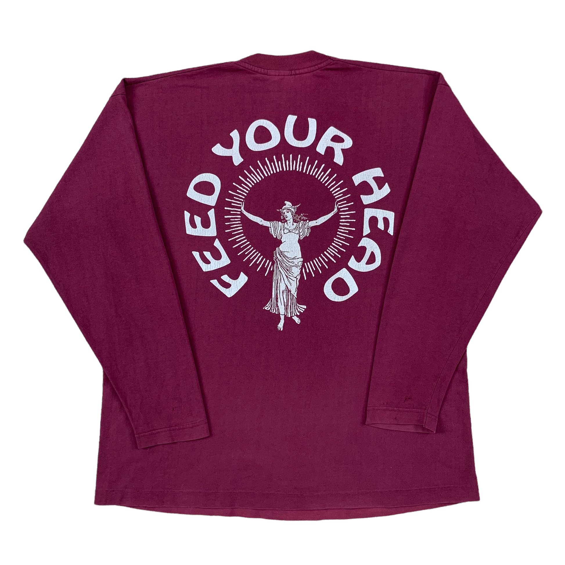 Sick 90s promo shirt for the ambient/psychedelic record label offshoot of Megadog rave promoters featuring crazy hand drawn artwork in the style used on their rave flyers throughout the years with an amazing ‘Feed Your Head’ backprint. Very lightly worn with a nice fade and no flaws.